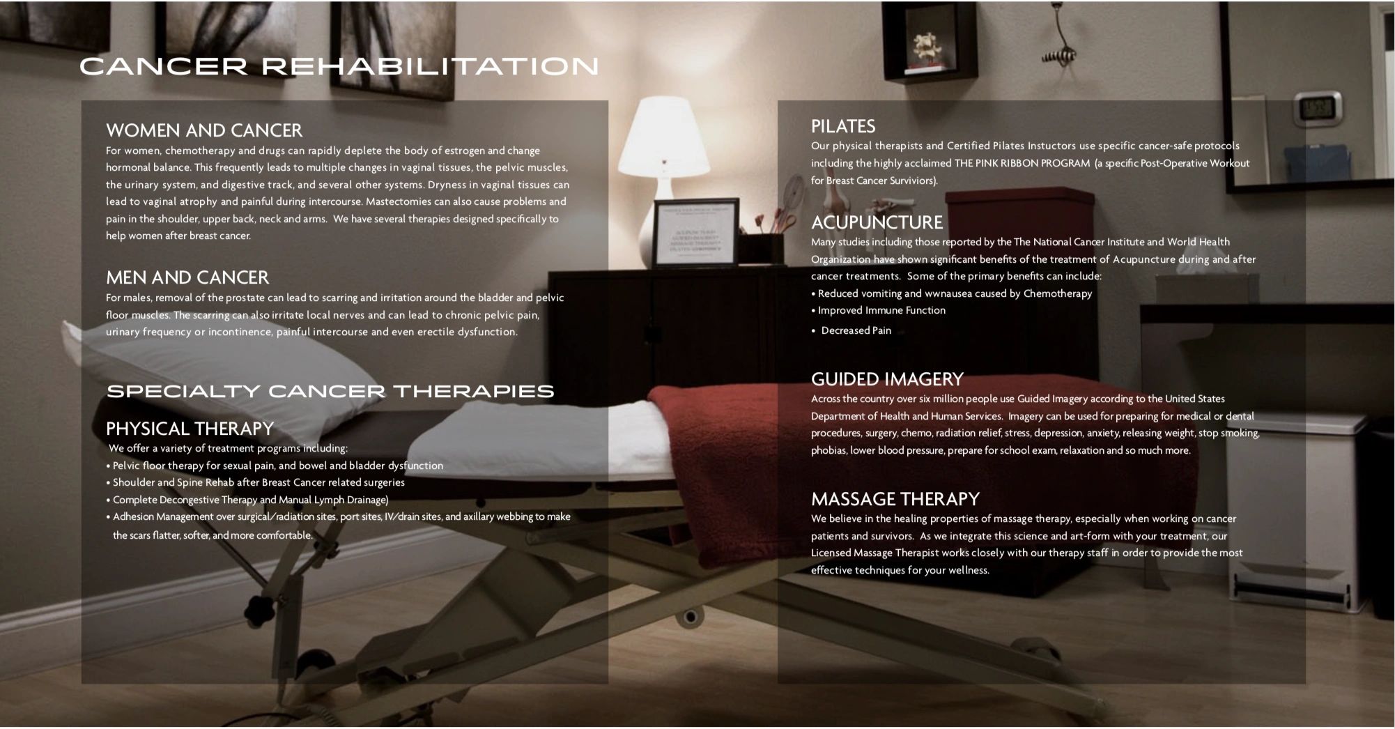 The first one of its kind, WOMANOLOGY + RESTORE HIM utilized research-based treatments of physical therapy, pilates, massage therapy, acupuncture, and guided imagery with the belief that it is imperative to communicate, educate, and integrate to provide the most effective environment for healing. Dedicated to educating the community and providing integrated therapies for bowel, bladder, and sexual dysfunction, the mission of this unique practice was to proclaim the message: 'YOU ARE NOT ALONE, YOUR CONDITION IS NOT IN YOUR HEAD, and we will do EVERYTHING in our power to help you.